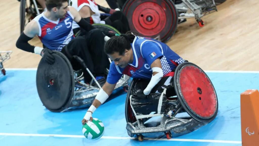 Le rugby fauteuil se joue à 4 contre 4 avec une balle de volley que les sportifs se passent en avant ou en arrière, le but étant de marquer un essai. Les fauteuils s'entrechoquent et font jaillir les éclats de rire. Le plus grand bonheur de Ryadh Sallem et l'équipe de France : remporter une médaille d'or aux Jeux paralympiques de Paris. Et quand on voit pendant l'entrainement les fauteuils se jeter les uns sur les autres, les chutes et les cascades, il n'y a pas de doute, on a affaire à une équipe de choc.