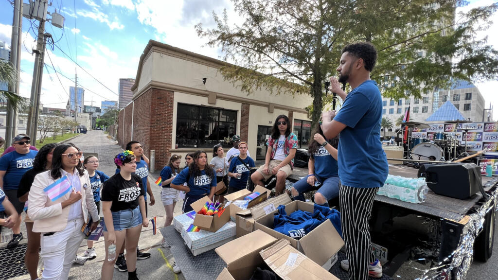 Il est en pleine répétition derrière sa batterie, avec ses musiciens. Il est installé à l’arrière d’un char bardé d’affiche de campagne à son nom. Maxwell Frost, 25 ans, candidat démocrate à la Chambre des représentants, s’apprête à parader au milieu de la Gay Pride d’Orlando.
